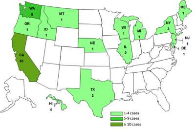 The number of ill people in each state is as follows: California (93), Delaware (1), Hawaii (4), Idaho (1), Illinois (2), Maine (1), Michigan (1), Montana (1), Nebraska (1), New Jersey (1), New York (3), Oregon (1), Texas (2), Washington (8), and Wisconsin (1). Illness onset dates range form July 3, 2012 to August 27, 2012. The age range is less than 1 year to 86 years; the median patient age is 30. Fifty-four percent of ill persons are female.