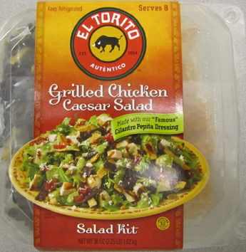 The recalled products are “El Torito Grilled Chicken Caesar Salad Kit” in 36 ounce trays, and 18-pound cases that contain eight 36-ounce trays of the Kits. The products have the establishment number “P-4140” inside the USDA mark of inspection. The cases have any of the following sell-by dates: “08/23/12,” “08/30/12,” “09/06/12,” or “09/14/12.”