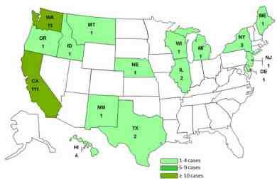 Among the 127 people who were interviewed, illness onset dates ranged from July 3, 2012 to September 1, 2012. The patient age range is from less than 1 year to 86 years, with a median age of 33 years. Fifty-six percent of ill persons were female. Among 101 persons who gave information, 33, or 33%, were hospitalized.
