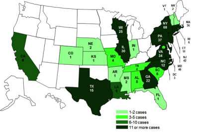 You can see the timeline of events, including the epidemiological curve of the outbreak, at the CDC site. Since the last update, on June 21, 2012, when 390 people were sickened, the outbreak has grown by 35 people, and one more state, New Hampshire, is included.