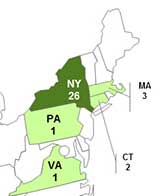 The outbreak strain of Shiga toxin-producing Escherichia coli O157:H7 (STEC O157:H7) sickened 26 people in New York, three in Mass., two in Conn. and one each in Pennsylvania and Virginia. Almost half of the victims, 46 percent, were hospitalized, two with hemolytic uremic syndrome (HUS), a type of kidney failure. There were no fatalities reported.