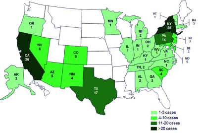 A total of 17 people have been reported from 9 states in this outbreak. Two new cases are from Tennessee and Texas. Illness onset dates range from October 20, 2011 to April 6, 2012. Age range is less than 1 year to 70 years; the median age is 3 years. Sixty-nine percent of patients are female. Four are hospitalized.