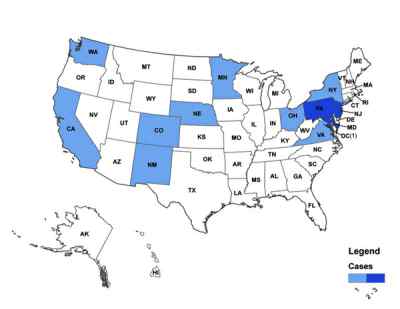 The number of patients in each state is: California (1), Colorado (1), District of Columbia (1), Maryland (3), Minnesota (1), Nebraska (1), New Jersey (3), New Mexico (1), New York (1), Ohio (1), Pennsylvania (2), Virginia (1), and Washington (1). The new cases are in New Jersey (2) and Pennsylvania (1). Six of the illnesses are related to a pregnancy. Two of the illnesses were diagnosed in newborns. The other 12 patients range in age from 30 to 87 years, with a median age of 75 years. Fifty-eight percent of the patients are female. One death was reported in Nebraska, New York, and Minnesota. One fetal loss was reported.
