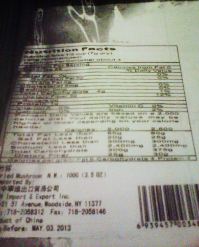 The mushrooms are packed in a 3.5 ounce (100 gram) plastic stray with the following code: BEST BEFORE: MAY 3rd, 2013. The UPC code is 6939457003484. The mushrooms are a product of China and were sold in New York City.