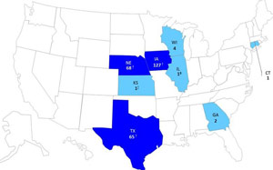 Case counts by state are as follows: Iowa (134), Nebraska (68), Texas (65), Wisconsin (4), Georgia (2), Connecticut (2), Illinois (1), Kansas (1). The cases in Illinois and Kansas may have been acquired out of state. New York and Florida also have reported cases to the CDC in recent weeks.