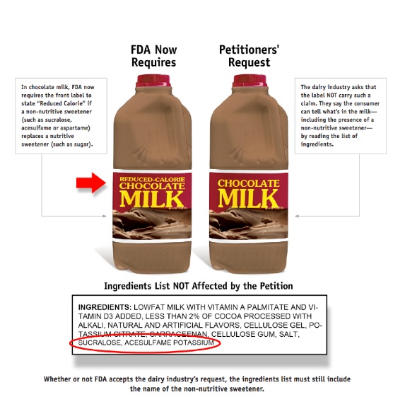 The petition would change the “standard of identity” for milk, which determines what ingredients food products must (or may) contain to be marketed under certain names. At this time, a manufacturer must modify the name of the food with a nutrient content claim (such as “reduced calorie”) if the product contains an ingredient that isn’t in the current standard of identity. For example, if chocolate milk is made with aspartame or sucralose, which are not present in ordinary milk, the label must state “reduced calorie”. The artificial sweetener in question must still be in the list of ingredients on the product label.