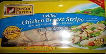 The product is 4.5 pound cases containing 12 6-ounce trays of “Foster Farms Grilled Chicken Breast Strips Boneless & Skinless with Rib Meat 97% Fat Free” with an identifying case code of “000606”. The product bears the establishment number “P-20923” inside the USDA mark of inspection and a use-by date of JUN 22 2013 on each tray. The product was made on April 23, 2013, and was distributed to retail establishments inĀ Arizona, California, Hawaii, Nevada, Oregon, Utah and Washington.