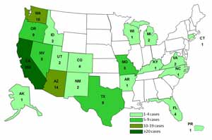 By state the case count is as follows: Alaska (1), Arkansas (1), Arizona (14), California (252), Colorado (4), Connecticut (1), Florida (4), Idaho (2), Kentucky (1), Michigan (2), Missouri (5), North Carolina (1), Nevada (9), New Mexico (2), Oregon (9), Puerto Rico (1), Texas (9), Utah (2), Virginia (2), Washington (15), and Wisconsin (1). Since the last update Oct. 11, 22 new cases have been reported from three states: Arizona (1), California (20), and Oregon (1).