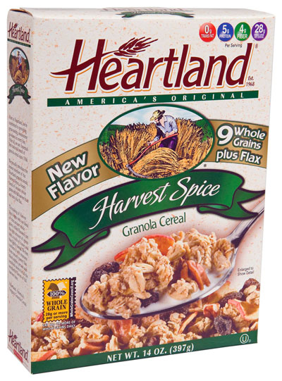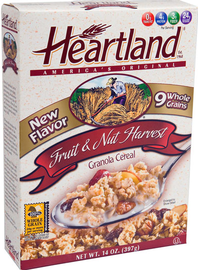 The cereals are Heartland® Harvest Spice Granola Cereal in 14 ounce packages with UPC number 024300 090394 and Best If Used By dates from 20130326 (March 26, 2013) through 20130910 (Sept. 10, 2013). Also recalled is Heartland® Fruit & Nut Harvest Granola Cereal in 14 ounce packages with UPC number 024300 090387 and Best If Used By dates from 20130325 (March 25, 2013) through 20130910 (Sept. 10, 2013).