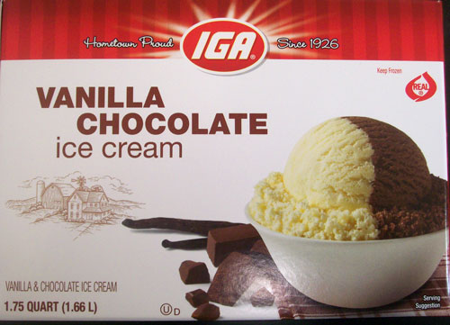 The recalled ice cream is IGA Brand “Vanilla & Chocolate” Ice Cream in 1.75 quart (1.66 liter) containers. The ice cream has plant code “3783” and a SELL BY date of 8-13-13. The containers contain Heavenly Hash ice cream, which does have almonds, coconut, and soy. The UPC number is 4127046131. The product is sold at IGA stores.