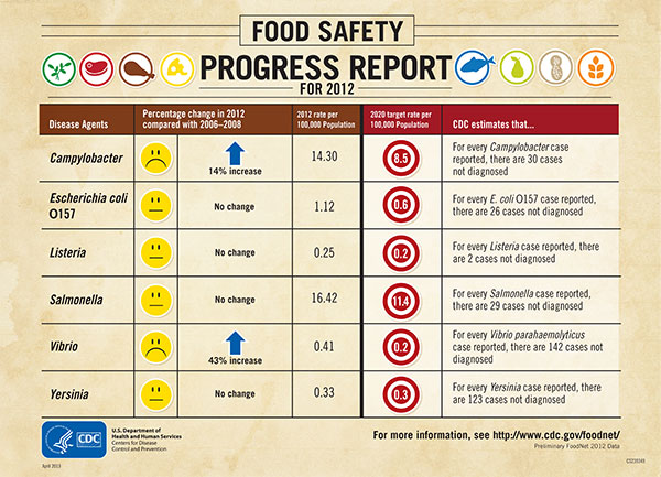 The Centers for Disease Control and Prevention (CDC) has released a snapshot of the report card for food safety issued by FoodNet. This data helps public health officials know how much progress (or lack of progress) has been made in reaching goals for reducing foodborne illness.