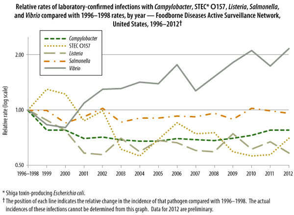 The chart above provides a stark reminder that the rates of laboratory-confirmed infections with Vibrio and Campylobacter are increasing. In response, Consumer Federation of America (CFA) released a statement saying that the data “demonstrate a need for greater vigilance in efforts to reduce illnesses from these pathogens.”