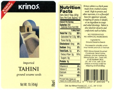 The recalled product is Krinos brand tahini sesame paste. It was distributed nationwide. The tahini is sold in 1 pound glass jars with UPC number 0-75013-28500-3, 2 pound glass jars with UPC number 0-75013-28510-2, and in 40 pound plastic pails with UPC number 0-75013-04018-3. The expiration dates for the products range from EXP JAN 01 – 2014 up to and including EXP JUN 8 – 2014 and EXP OCT 16 – 2014 up to and including EXP MAR 15 – 2015.