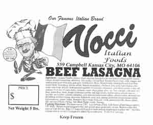 The products under recall are: 5-lb. steamer tin pans of “VOCCI ITALIAN FOODS BEEF LASAGNA” with the establishment number “EST. 5789” inside the USDA mark of inspection on the label and 20-lb. cases containing four, 5-lb. steamer tin pans of “VOCCI ITALIAN FOODS BEEF LASAGNA” with the establishment number “EST. 5789” inside the USDA mark of inspection on the label.