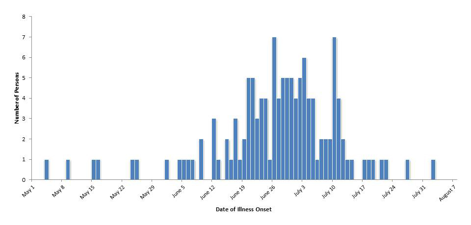 The 19 states that reported spikes in cases of cyclosporiasis this summer are: Arkansas, California, Connecticut, Florida, Illinois, Maine, Maryland, Massachusetts, Michigan, Minnesota, Montana, Nebraska, Pennsylvania, New Jersey, New York , Texas, Virginia, Wisconsin, and Washington. Fifty six percent of the case patients, who range in age from 3 to 88, are female. The median age is 49. Seven people were hospitalized.