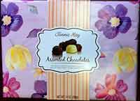 The boxes are light purple with spring flowers. A white label with a picture of five chocolates, the name “Fannie May,” and the descriptions “Assorted Chocolates,” and “rich dark & milk chocolates & pastels with an assortment of decadent filling” appears on an orange-striped band in the center of the box.