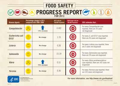 There isn’t much progress in the the Centers for Disease Control and Prevention’s Food Safety Progress Report for 2013. The annual report which tracks reported cases of infection from foodborne pathogens such as Salmonella, Listeria, E. coli and Campylobacter, shows rates have remained flat in most cases and increased in others.