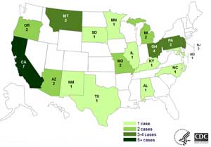 By state the case counts for the outbreak, which has been ongoing since January, is as follows: Alabama (1), Arizona (2), California (7), Illinois (1), Kentucky (1), Maryland (1), Michigan (2), Minnesota (1), Missouri (2), Montana (3), New Jersey (3), New Mexico (1), North Carolina (1), Ohio (4), Oregon (2), Pennsylvania (3), South Dakota (1), and Texas (1).